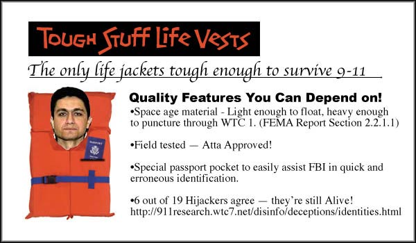What about the plane parts government found? Engines and landing gear could have flown out of either tower, although we seem to lack solid eyewitness testimony and video evidence of major parts flying out. Spencer suspects that a canister was propelled from the NE corner of the South Tower with “debris” to support the passenger plane hoax. Some photos and videos show unidentified objects shooting out, for example, p. 39 in Hufschmid’s Painful Questions. The FBI and FEMA—a black ops agency with virtually no investigative expertise then headed by Bush campaign manager and family loyalist Joe Allbaugh—displayed a few parts during their felonious mission to destroy crime-scene evidence. None of the parts are consistent with 767 crashes (substantial sections of unburned fuselage, a 737 engine part, a piece of unburned landing gear) nor have they been independently verified and matched by serial number against the maintenance logs of the specified aircraft. This piece is a 737 engine part (CFM 56) according to aircraft experts rather than from a 767. By contrast, the authorities found an alleged hijacker’s paper passport that survived a fiery crash, subsequent fire and tower demolition. Its purpose obviously was to tell a bloodthirsty America whom to hate.